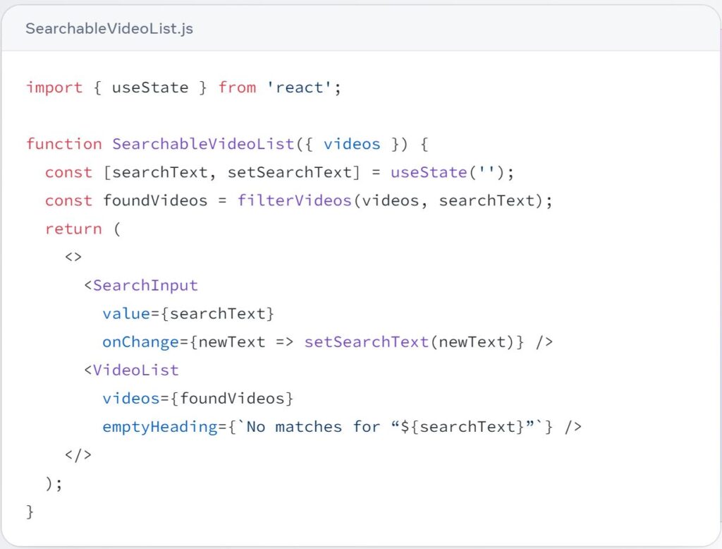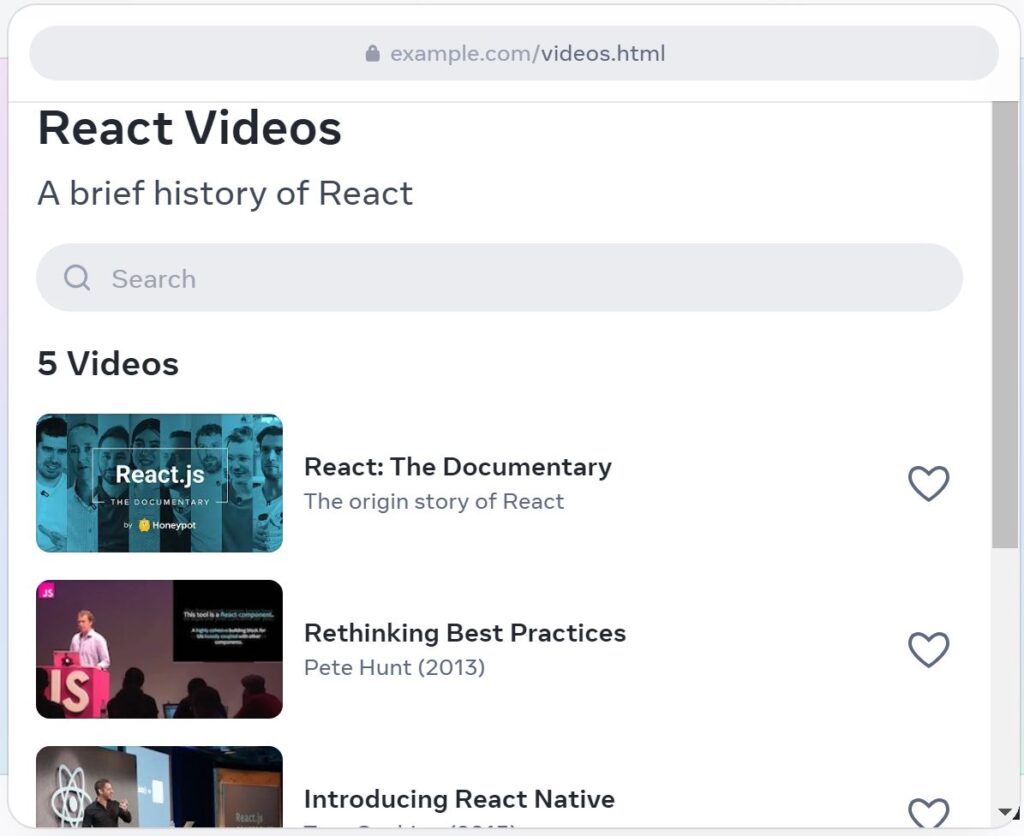 نمونه از کد React که ویدئوهای قابل جستجو را لیست می کند:
